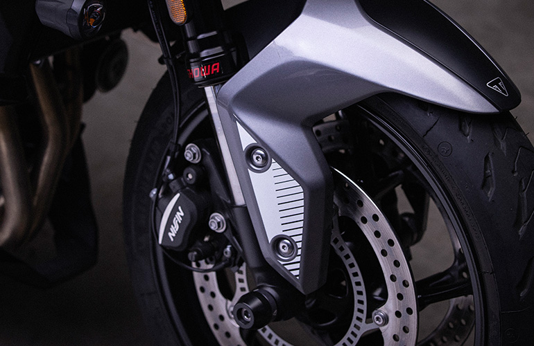 Тормозная система от Nissin работает в четкой связке с продвинутой системой ABS, которая учитывает наклон мотоцикла. Tiger Sport 660 отличается превосходной динамикой замедления с отличной обратной связью. Даже если под колесами мокрый асфальт или сложный рельеф система курсовой устойчивости помогает поддерживать оптимальный баланс шасси, обеспечивая безопасное и контролируемое движение без ущерба для удовольствия.