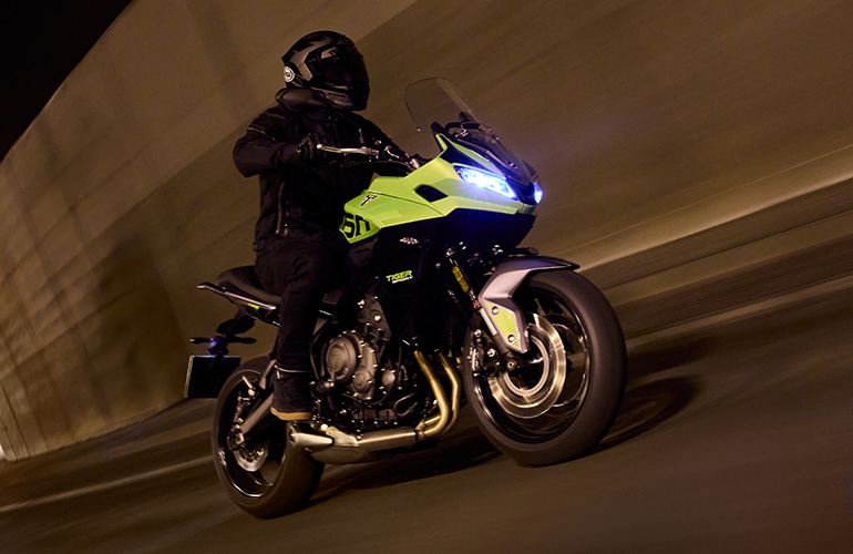 Вы можете путешествовать уверенно и днём, и ночью благодаря яркой полностью светодиодной светотехнике Tiger Sport 660. Мощные фары обеспечивают чёткую видимость ночью, а дневные ходовые огни гарантируют вашу видимость в любых условиях. Мотоцикл узнаваем по своему уникальному световому профилю как спереди, так и сзади - там также элегантные светодиодные элементы: задний габаритный фонарь, стоп-сигнал и самоотключающиеся указатели поворота.