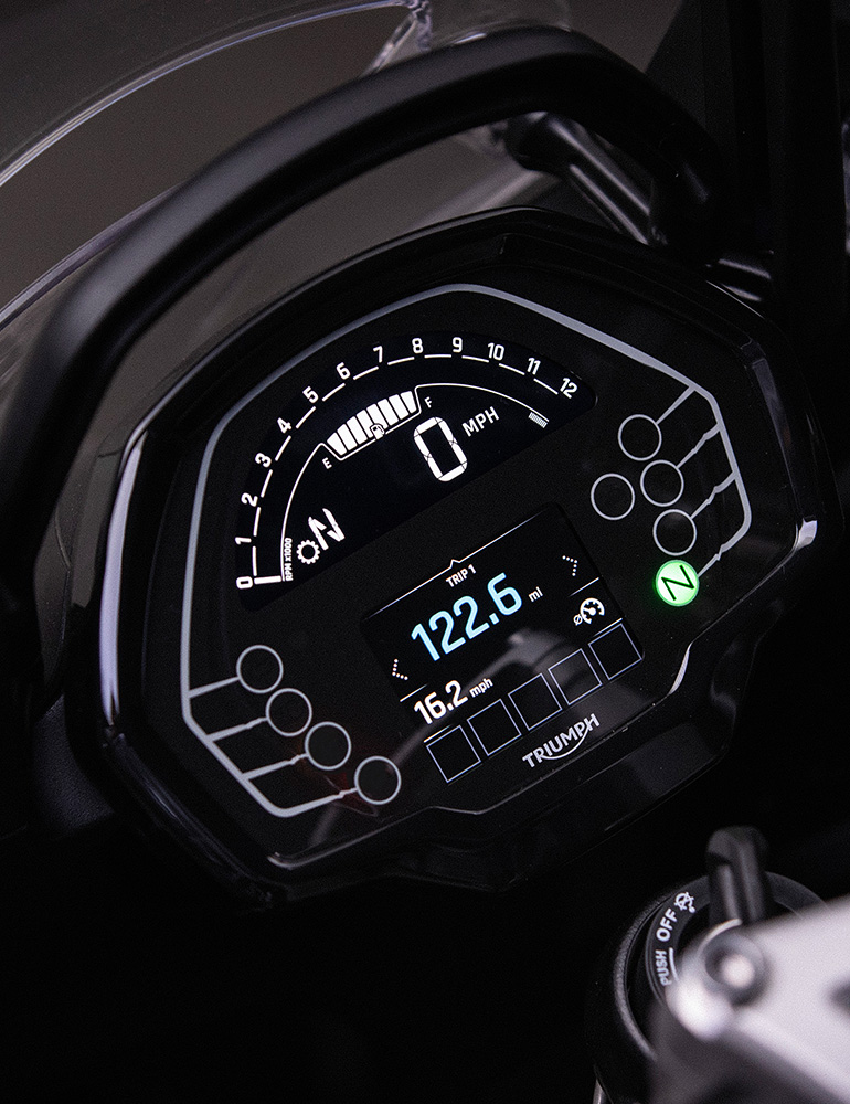 Вся необходимая информация от бортовых систем выводится на многофункциональный высококонтрастный ЖК-дисплей приборной панели. В стоке имеется система My Triumph с модулем Bluetooth, с которым доступны пошаговая навигация, управление музыкой и звонками с телефона. Оставайтесь в курсе всех событий, планируйте маршруты и развлекайтесь, не отвлекаясь от управления мотоциклом!